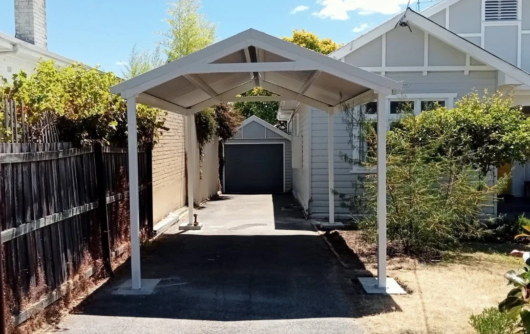 3.4m x 5.3m Gable Patio x 2.4m high with a 22.5° pitch. Clad in Colorbond Surfmist, with Colorbond Thredbo White posts & beams.
